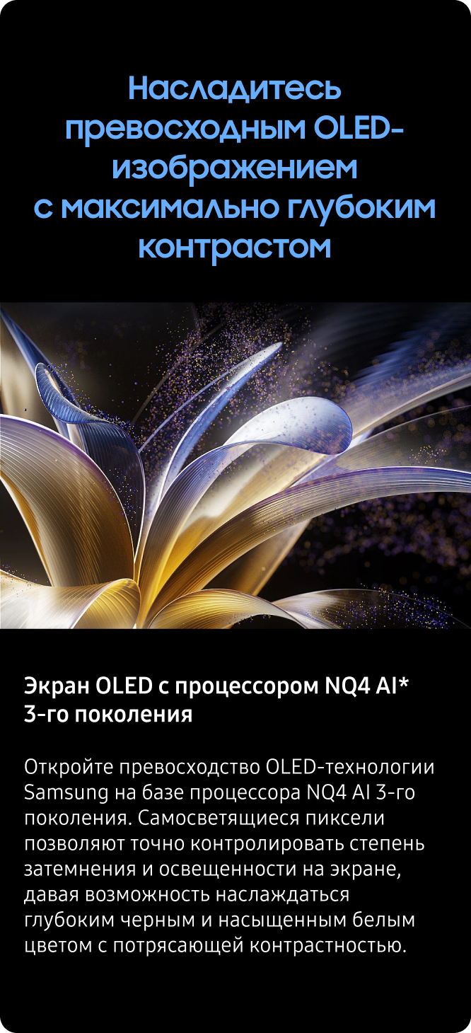 *Изображения смоделированы и предназначены только для иллюстрации. Внешний вид и конструктивные характеристики, не влияющие на работу продукта, могут быть изменены без предварительного уведомления. Интерфейс, содержимое и сервисы могут отличаться в зависимости от региона и могут быть изменены без предварительного уведомления пользователя. *Эффект от просмотра может отличаться в зависимости от типа контента и формата. *Функции могут отличаться в зависимости от модели. Для получения дополнительных подробностей уточняйте спецификацию каждой модели. *Телевизор №1 в мире (Global No.1 TV): Источник - Omdia, февраль 2025 г.. Результаты не являются рекламной кампанией Samsung. Использование ссылок на результаты возможно только на собственный страх и риск.