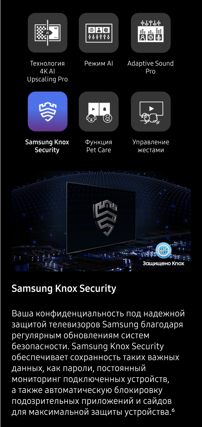 *Доступность контента и сервисов зависят от региона и это может меняться без предварительного уведомления пользователей. Перед использованием нужно принять Положения и условия сервиса Smart Hub, а также Политику конфиденциальности. Некоторые материалы и сервисы требуют регистрации и подписки.Требуется учетная запис Samsung.Обновление ОС Tizen будет поддерживаться до 7 лет, начиная с 2025 года для продуктов, выпущенных в 2025 году. Следует заметить, что обновление не распространяется на рабочие характеристики телевизора, функции или долговечность.